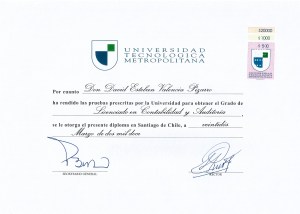 Licenciado en Contabilidad y Auditoría, Graduado de la Universidad Tecnológica Metropolitana del estado de Chile (UTEM)